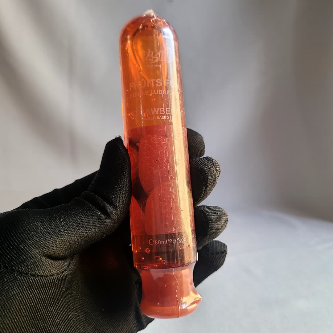 lubricantes personales comestibles a base de agua de la marca Fruits Fun. Vienen en diferentes sabores, incluyendo fresa, arándano y naranja.